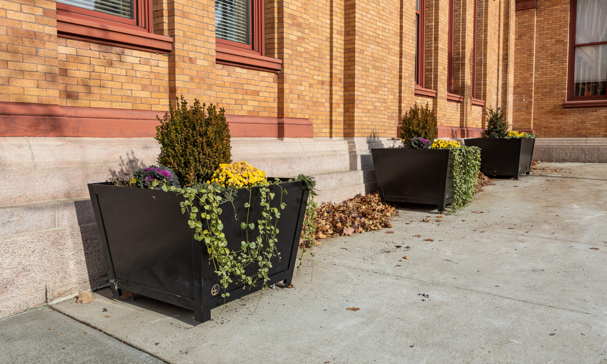 The sidewalk outside of RI Foundation is lined with sleek planters! Designed and fabricated by The Steel Yard Public Projects team, each planter features a raised base, drainage, durable satin powder coat finish, and 4 height-adjustable feet to help it appear flat despite sitting on a sloped street.