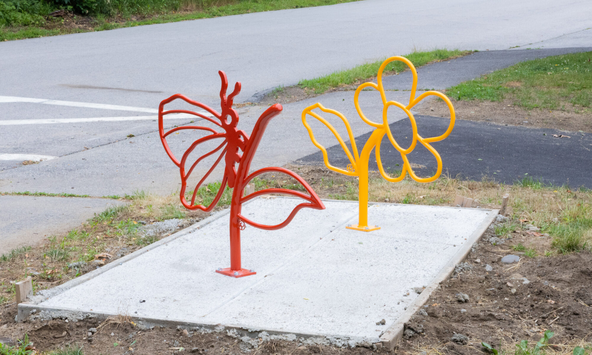 Town of North Kingstown commissioned The Steel Yard Public Projects for artistic bike racks at Yorktown Park. Designer Rena Rong pulled inspiration from the park’s pollinator garden to create these vibrant works of functional art. The bike racks were fabricated and installed by The Steel Yard team.